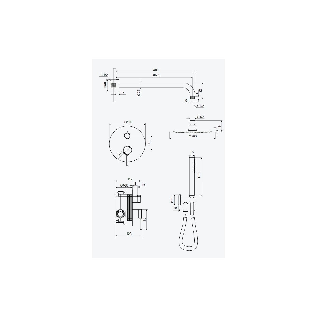 Lieferumfang: Batterie mit Schalter, Duschkopf, Duschkopf, Duschschlauch, Duscharm, Eckanschluss