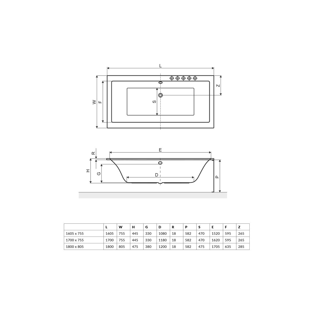 - Fassungsvermögen der Badewanne bis zum Überlauf: 215 Liter