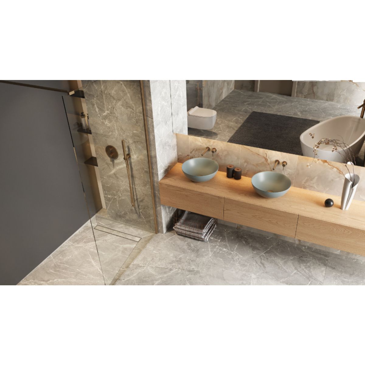 Der Stilio-Linienablauf ist aus hochwertigem Edelstahl gefertigt und mit einer kupferfarbenen PVD-Beschichtung versehen. Der Ablauf verfügt über eine praktische vertikale und horizontale Verstellbarkeit der Füße im Bereich von bis zu 30 mm.