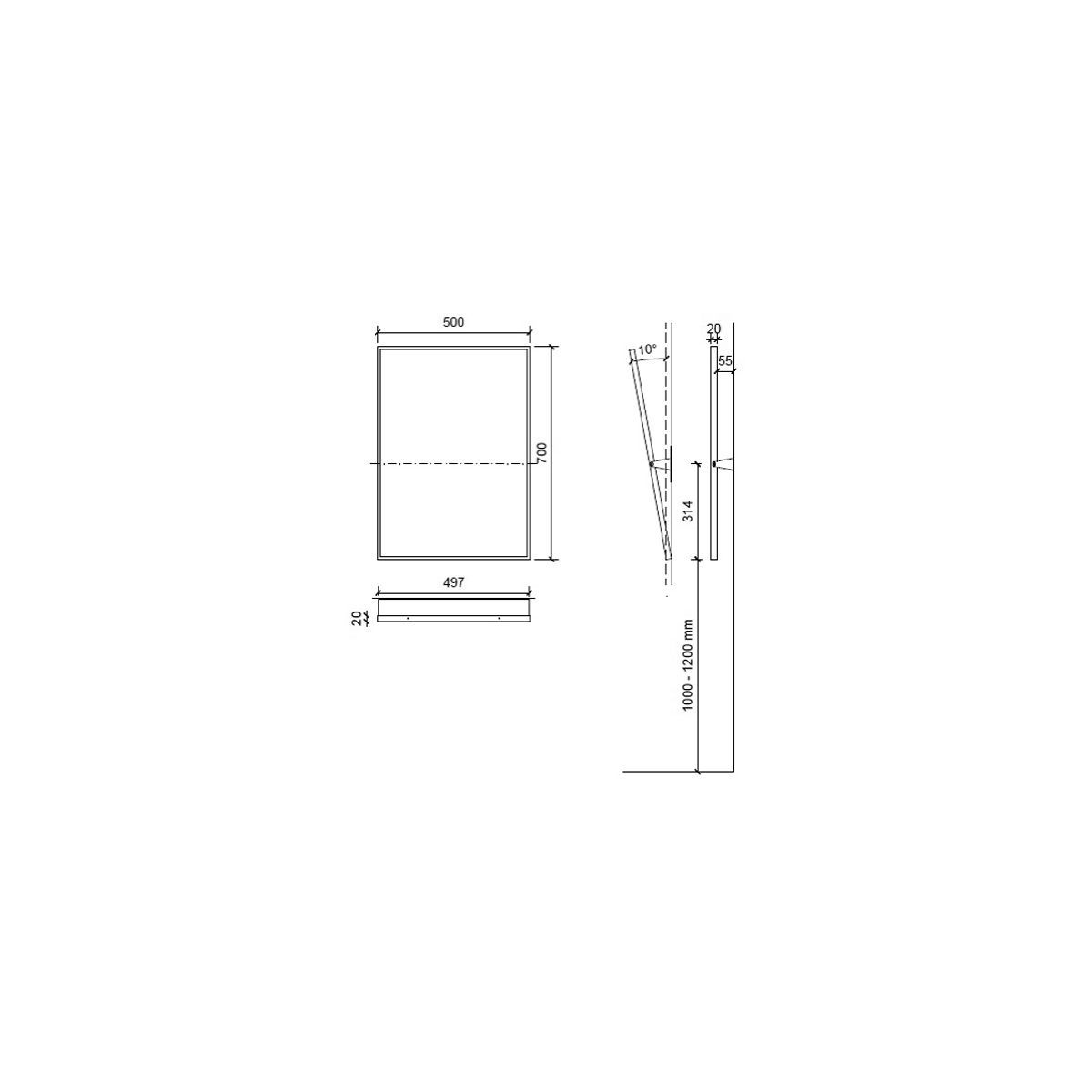 - Spiegel: Höhe 700 mm, Breite 500 mm, Tiefe 75 mm