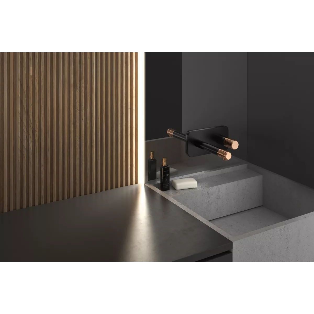 Ein großer Vorteil der Unterputz-Waschtischarmatur ARDESIA ist die Minimierung der äußeren Elemente, wodurch Beschädigungen verhindert werden und die Reinigung erleichtert wird. Das matte Schwarz, ergänzt durch glänzendes Roségold, das den Griff und das Ende des Auslaufs bedeckt, verleiht der Armatur Eleganz und Prestige. Funktional – ausgestattet mit einem Joystick-Griff – passt sie perfekt zu den neuesten Trends in der Badgestaltung.