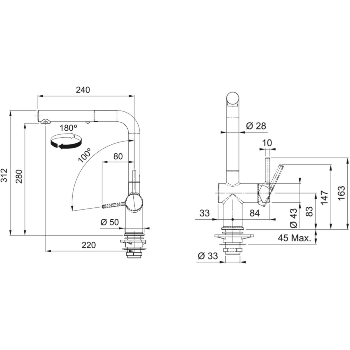 - schwenkbarer Auslauf mit einem Schwenkwinkel von 180º