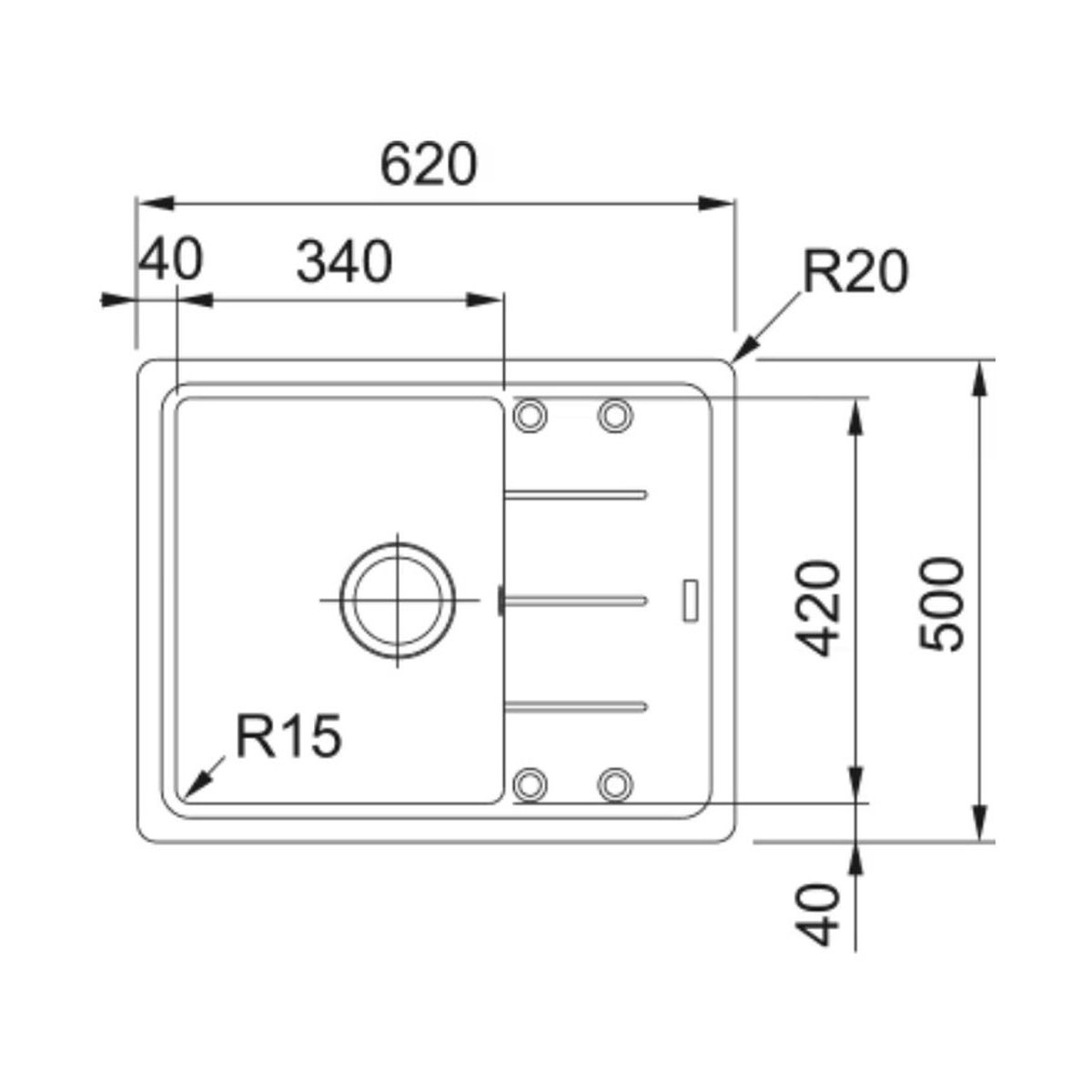 - 4 vorgefräste Löcher für Armaturen