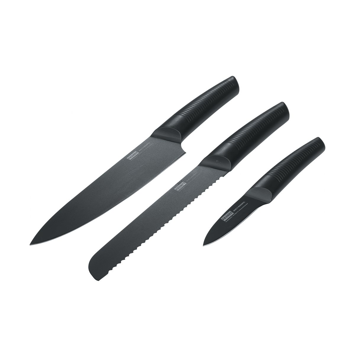 Messerset für Spülbecken Box Center BWX. 3 praktische Messer aus Edelstahl. Das Set enthält: ein Brotmesser, ein Kochmesser und ein Gemüsemesser. Farbe: schwarz.
