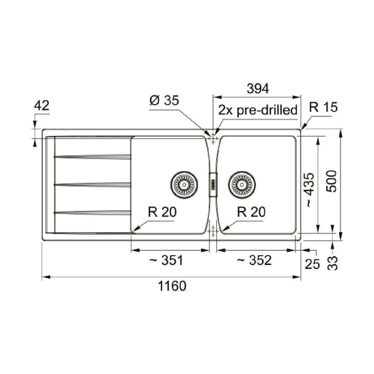 - Anzahl der Löcher für die Armatur: 2 - vorgefräst