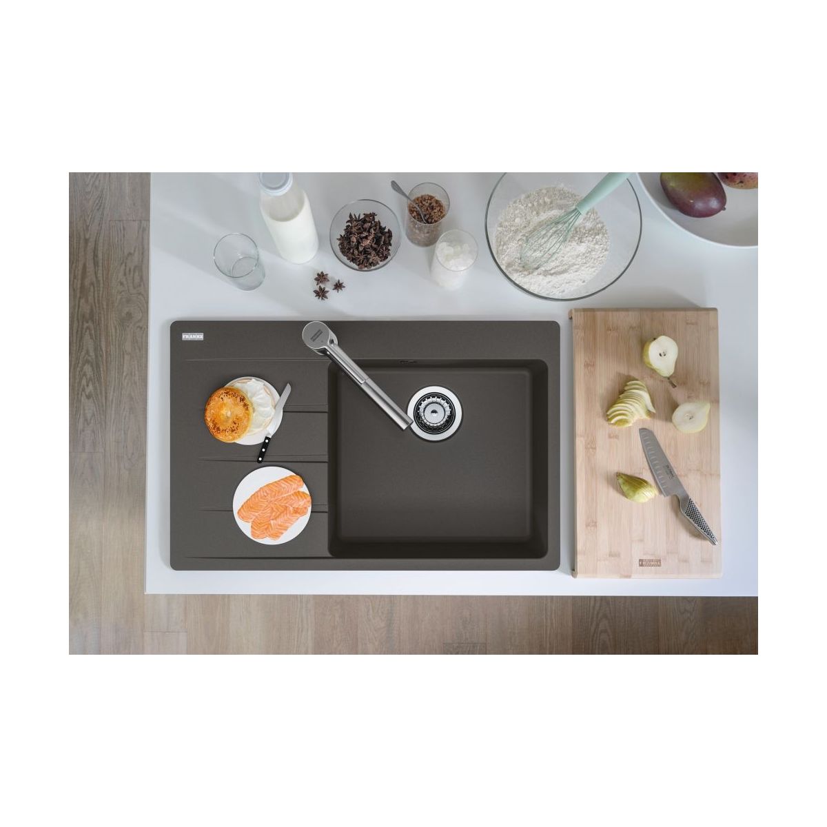Fragranite-Spülen sind die perfekte Kombination aus Eleganz, Langlebigkeit und Komfort. Dank eines Anteils von 80 % natürlichem Quarz fühlt sich die Oberfläche angenehm an und ist gleichzeitig widerstandsfähig gegen alltägliche Herausforderungen – darunter Flecken, Kratzer und kurzzeitige Einwirkung hoher Temperaturen. Franke Granitspülen zeichnen sich durch eine außergewöhnliche Widerstandsfähigkeit gegen mechanische Beschädigungen aus, was sie zur idealen Wahl für stark frequentierte Küchen macht. Dank ihrer besonders glatten Struktur sind Fragranite-Spülen leicht zu reinigen und hygienisch zu pflegen. Das Material hemmt auf natürliche Weise das Wachstum von Bakterien und Mikroorganismen, sodass Franke-Spülbecken hohen Hygienestandards entsprechen. Darüber hinaus sorgt ihre Langlebigkeit dafür, dass sie viele Jahre lang ihr ästhetisches Aussehen behalten, was sie zur perfekten Wahl für jede moderne Küche macht. Zuverlässige Hygiene Franke-Spülbecken sind eine Lösung, die Pflegeleichtigkeit mit außergewöhnlicher Hygiene verbindet. Dank ihrer glatten Oberfläche, die das Wachstum von Bakterien und Mikroorganismen auf natürliche Weise hemmt, sind sie die ideale Wahl für moderne Küchen und gewährleisten Sauberkeit und Sicherheit bei der Verwendung.
