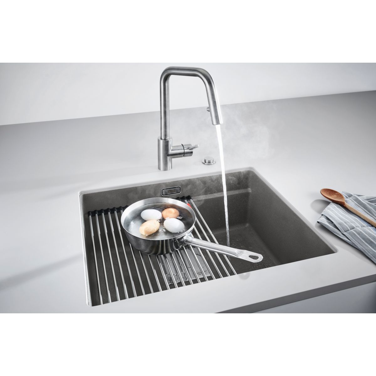 Fragranite-Spülbecken sind die perfekte Kombination aus Eleganz, Langlebigkeit und Komfort. Dank ihres Gehalts von bis zu 80 % natürlichem Quarz fühlt sich die Oberfläche angenehm an und ist gleichzeitig widerstandsfähig gegen die täglichen Herausforderungen – darunter Flecken, Kratzer und kurzzeitige Einwirkung hoher Temperaturen. Franke Granitspülen zeichnen sich durch eine außergewöhnliche Widerstandsfähigkeit gegen mechanische Beschädigungen aus, was sie zur idealen Wahl für stark frequentierte Küchen macht. Dank ihrer besonders glatten Struktur sind Fragranite-Spülen leicht zu reinigen und hygienisch zu pflegen. Das Material hemmt auf natürliche Weise das Wachstum von Bakterien und Mikroorganismen, sodass Franke-Spülbecken hohen Hygienestandards entsprechen. Darüber hinaus sorgt ihre Langlebigkeit dafür, dass sie über viele Jahre hinweg ihr ästhetisches Aussehen behalten, was sie zur perfekten Wahl für jede moderne Küche macht. Zuverlässige Hygiene Franke-Spülbecken sind eine Lösung, die Pflegeleichtigkeit mit außergewöhnlicher Hygiene verbindet. Dank ihrer glatten Oberfläche, die das Wachstum von Bakterien und Mikroorganismen auf natürliche Weise hemmt, sind sie die ideale Wahl für moderne Küchen und gewährleisten Sauberkeit und Sicherheit bei der Verwendung.- Außenmaße: 56 x 46 cm