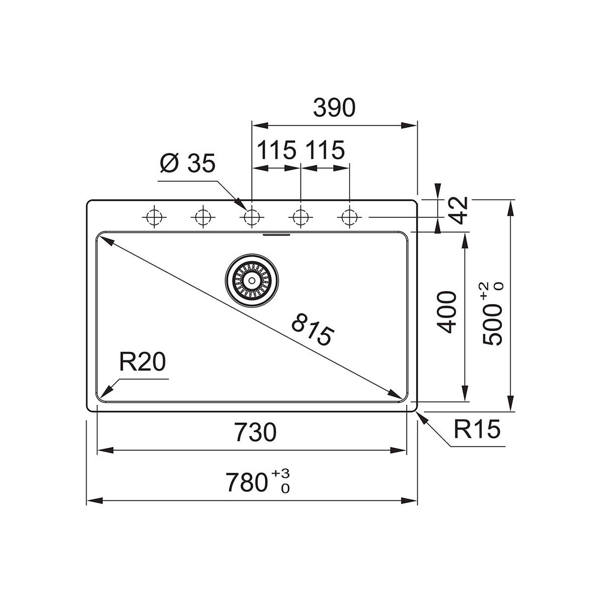 - Anzahl der Öffnungen (für Wasserhahn, Drehknopf für automatischen Stöpsel, Sonstiges): 5 vorgefräst