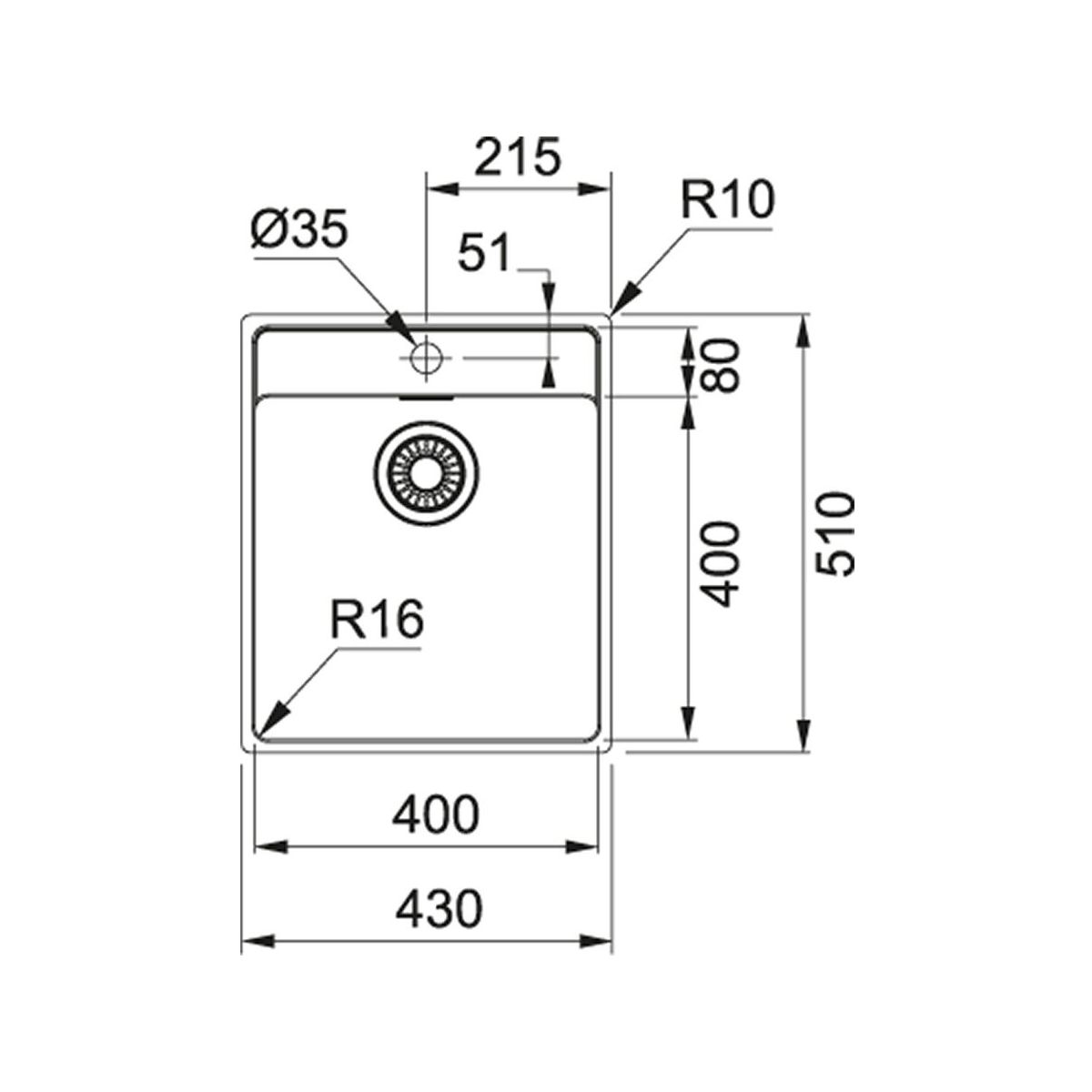 - Abmessungen des Spülbeckens: 43 x 51 cm