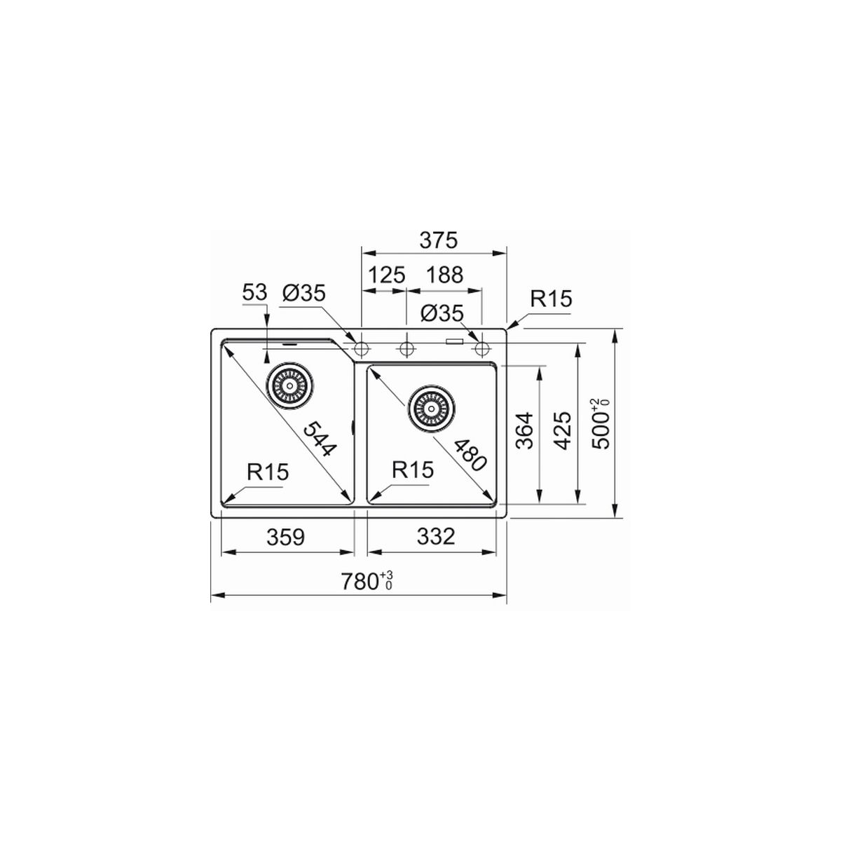 - 3 vorgefräste Löcher für Armaturen