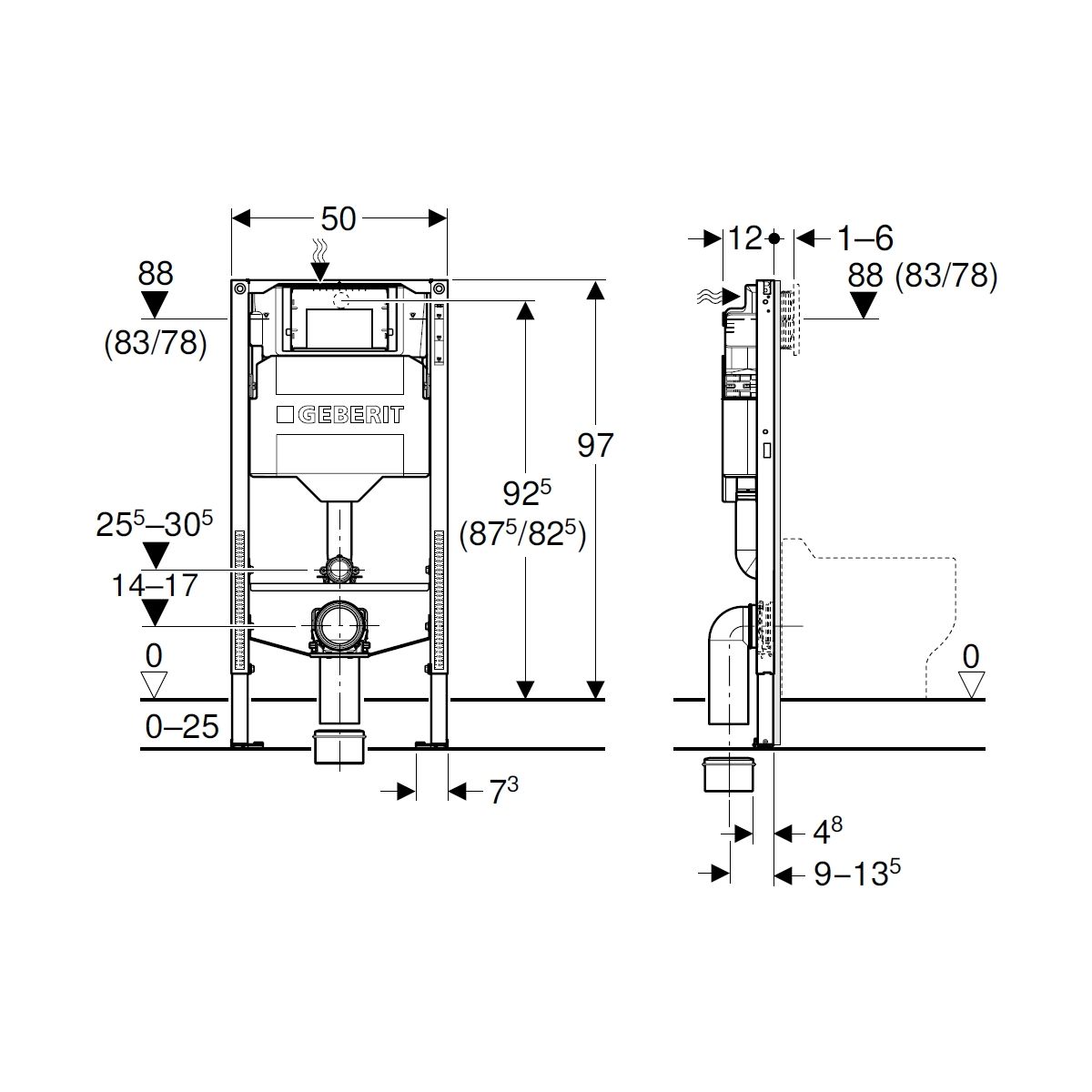 - mit ausziehbarer Blechplatte zur seitlichen Befestigung über dem Element an Metall- oder Holzprofilen oder an Geberit Duofix-Konstruktionselementen