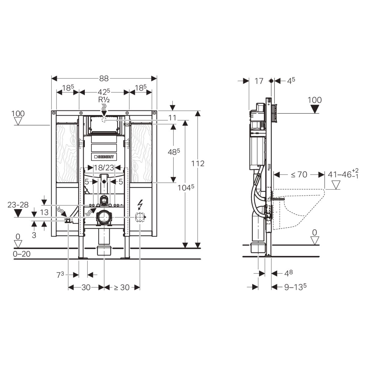 - Rahmen für Wand-WC-Becken mit Anschlussmaßen gemäß EN 33 und einer Ausladung von bis zu 70 cm