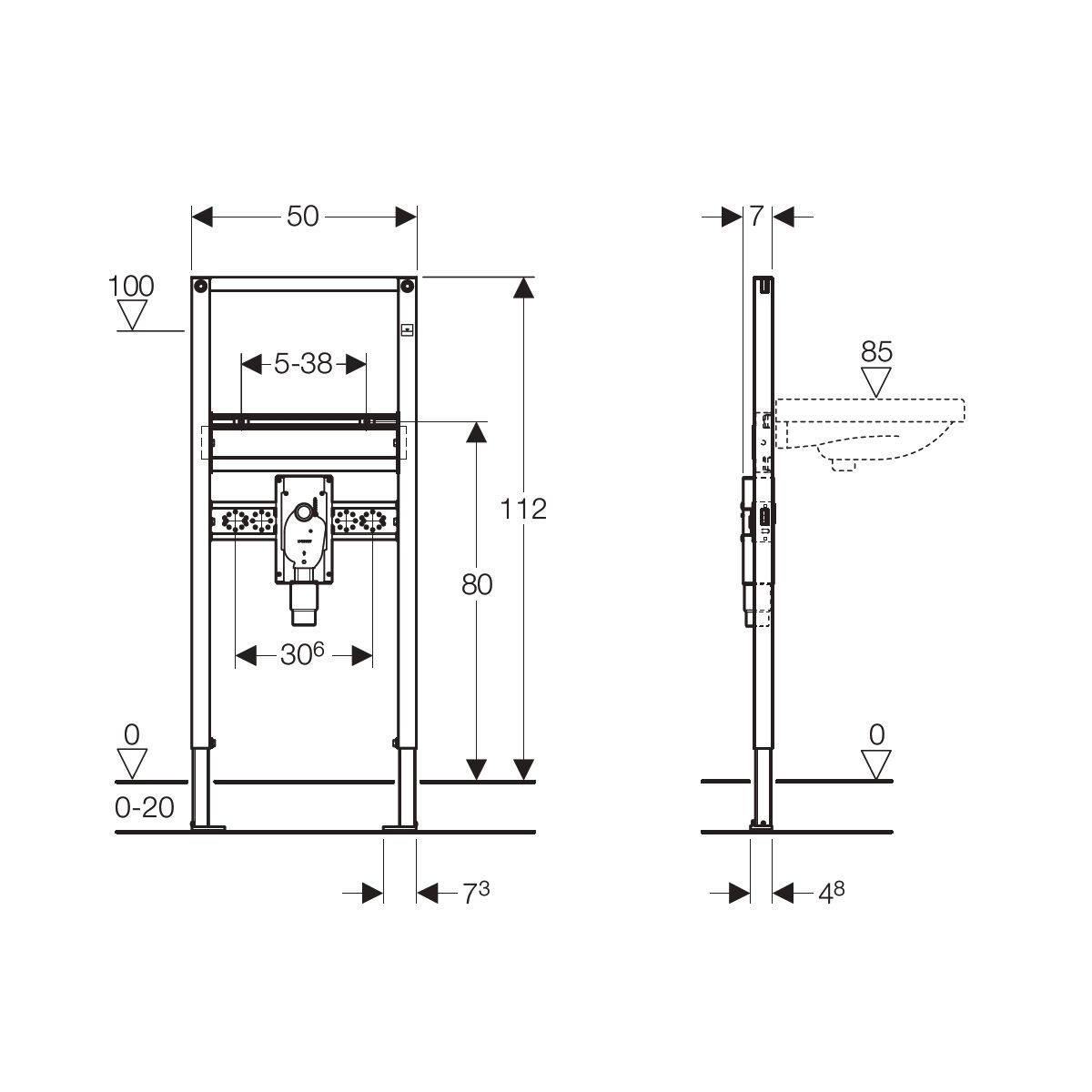 - Wandablaufgarnitur mit einer Höhenverstellbarkeit von ± 3 cm bei der Endmontage