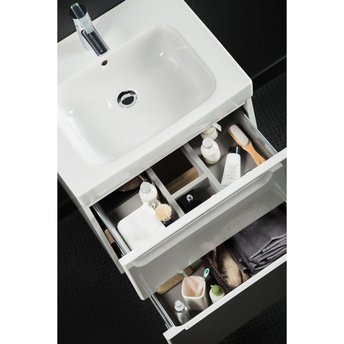 - Aussparung für Siphon in der oberen Schublade