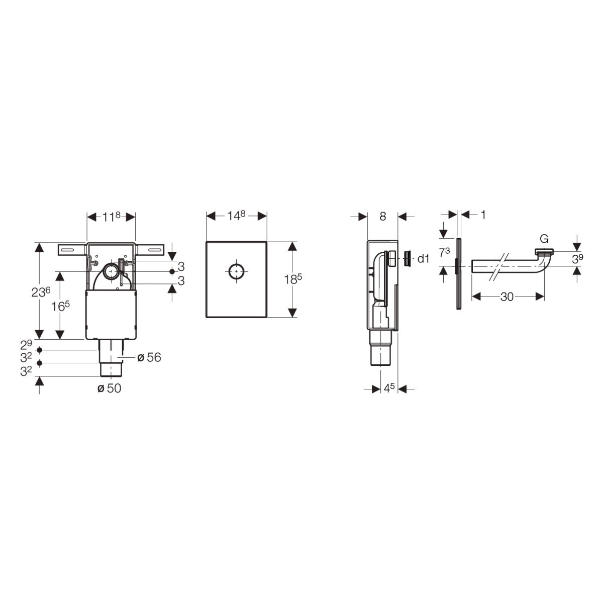 - Wandablaufgarnitur mit einer um ± 3 cm verstellbaren Höhe bei der Endmontage