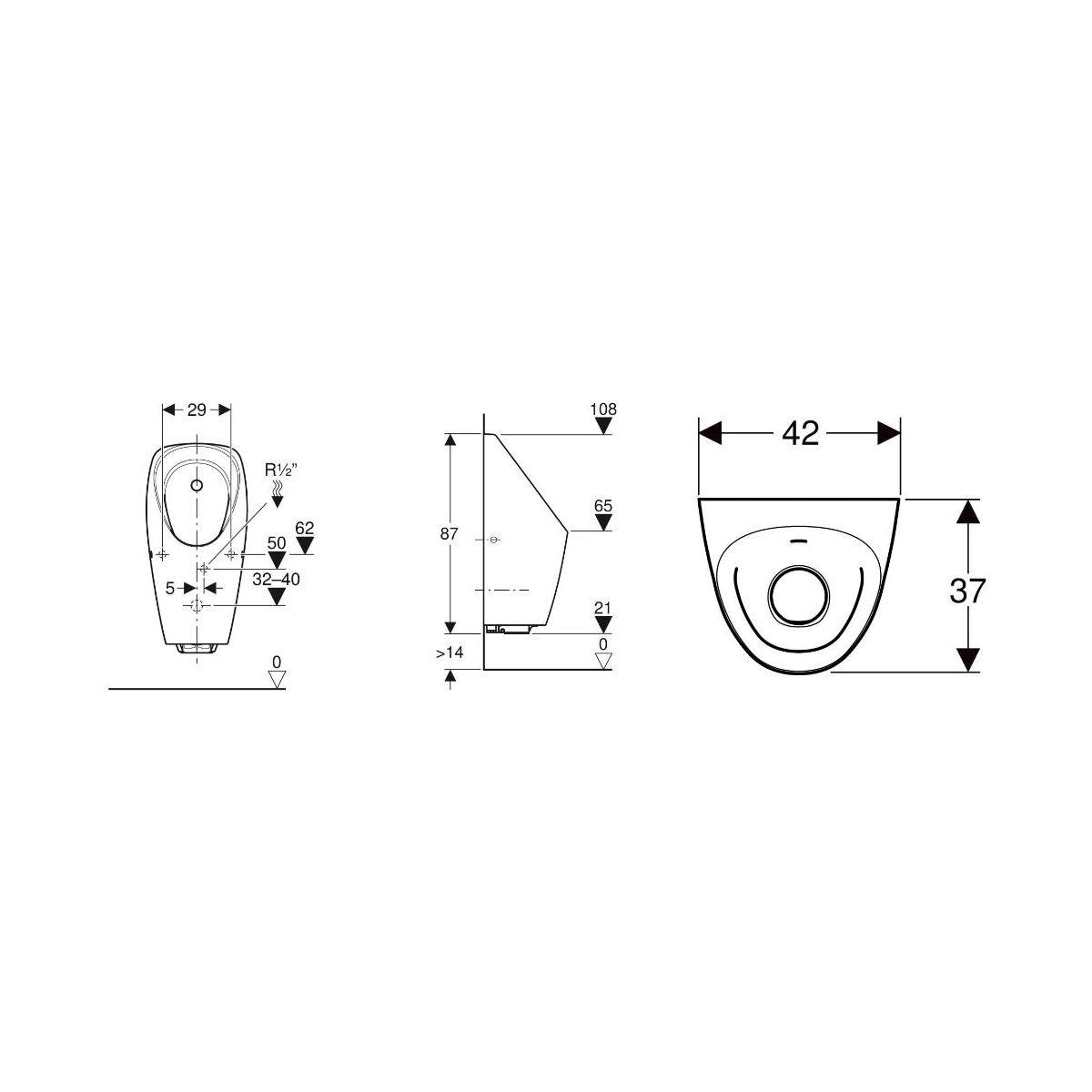 - Um das Spülventil für Urinale ohne Demontage der Keramik zu montieren und zu demontieren, muss die Höhe vom unteren Rand des Urinals mindestens 58 cm über dem fertigen Boden betragen