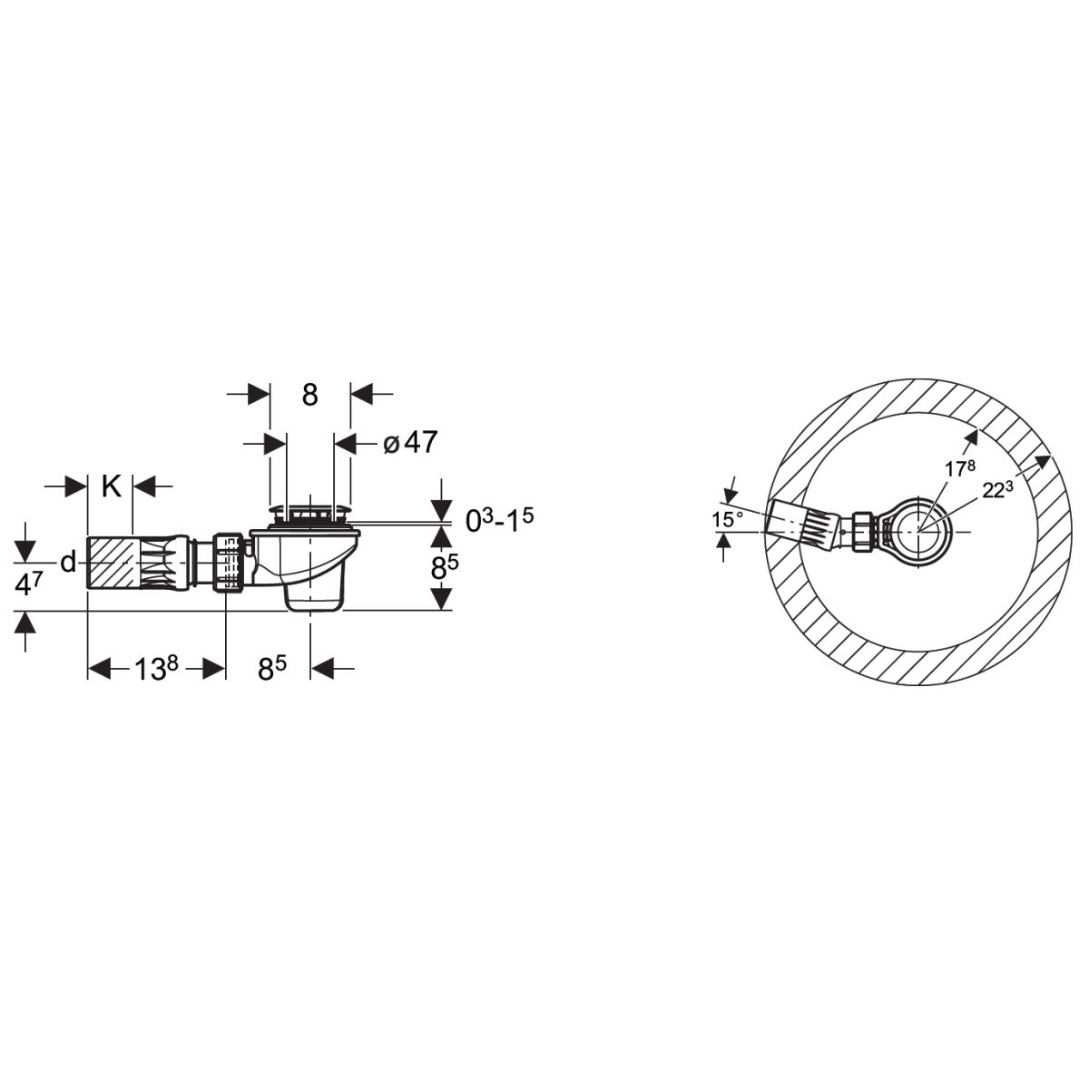 - Ablauf mit Kugelgelenk mit einem Neigungswinkel von bis zu 15°