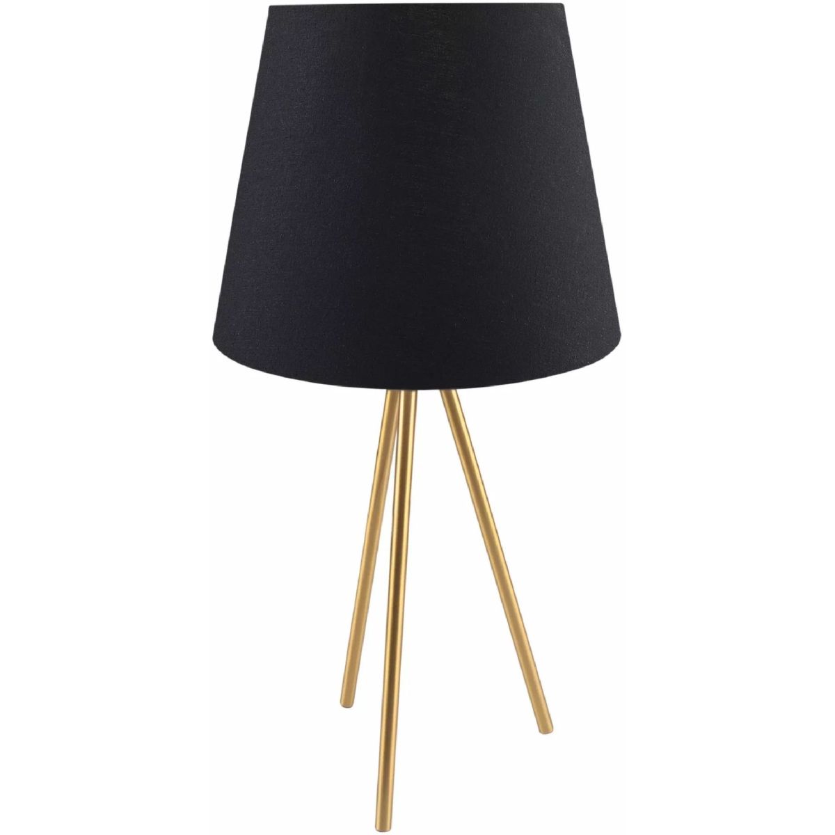 Die Tischleuchte Goldlux Elena ist eine Kombination aus Schlichtheit und Raffinesse. Die 61 cm hohe und 30 cm breite Konstruktion besteht aus einem schwarzen Lampenschirm aus Stoff und einem stabilen Metallfuß.