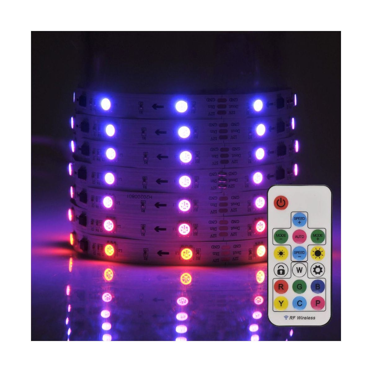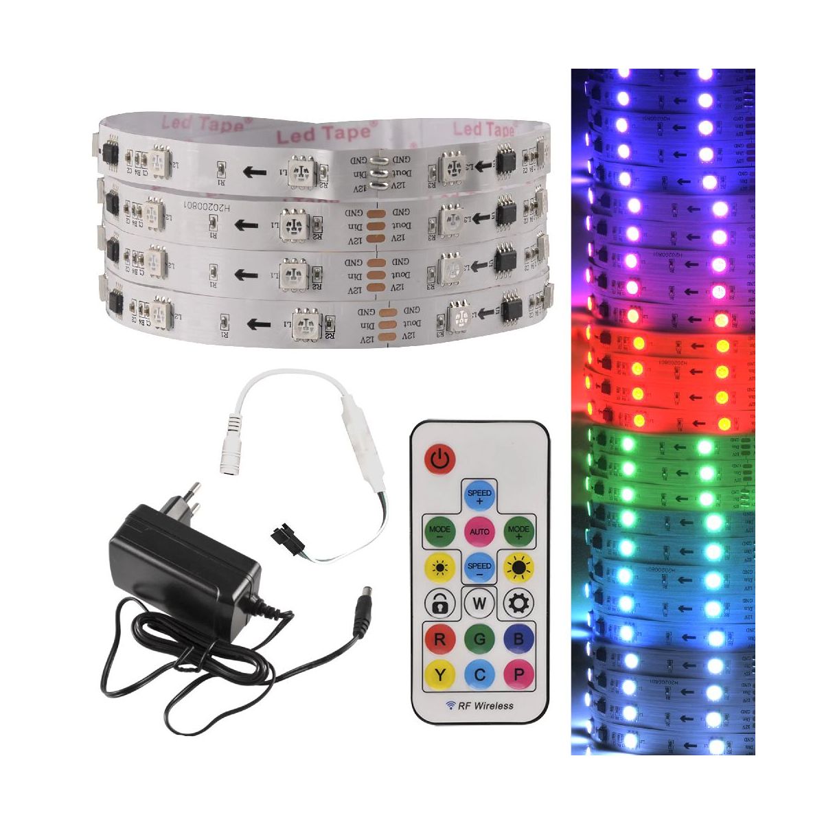 - Das Set enthält ein 5 m langes LED-Band, einen Controller, eine Fernbedienung (Batterie im Lieferumfang enthalten), ein Netzteil für LED-Bänder 12 V, 1 A, 12 W, eine Bedienungsanleitung