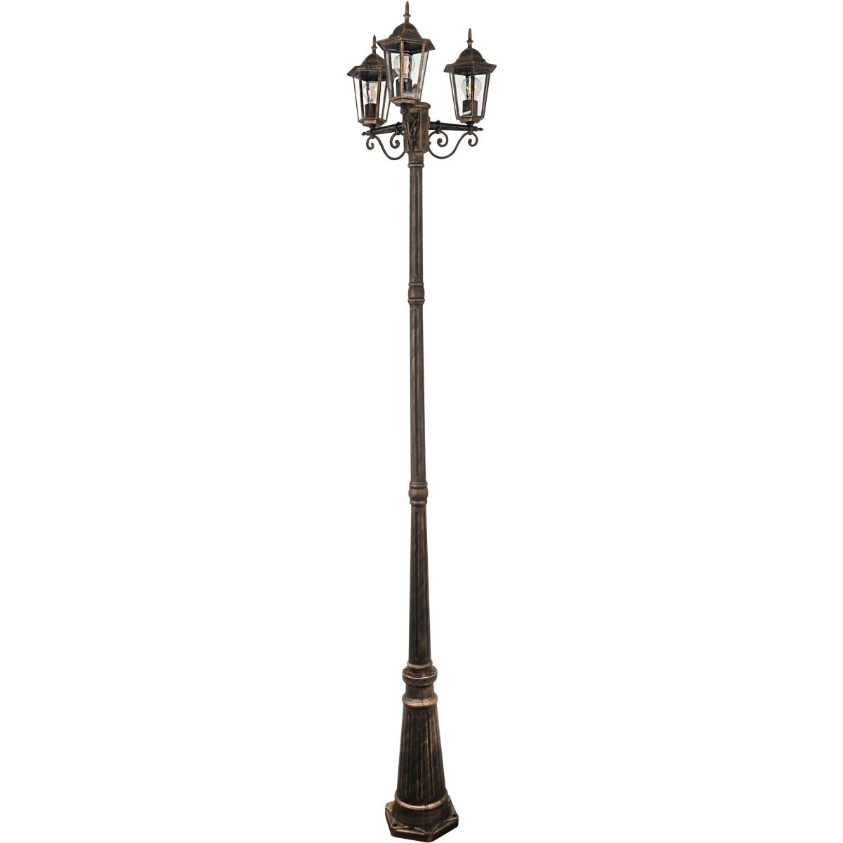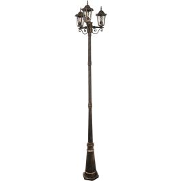 Die Lampe Goldlux Liguria ist ein Angebot für alle, die Eleganz in klassischer Form schätzen. Die drei Lampenschirme, die auf einem 258 cm hohen Mast angebracht sind, erinnern an traditionelle Laternen und schaffen eine einzigartige Atmosphäre im Garten, in der Einfahrt oder auf der Terrasse. Die patinierte Oberfläche verleiht dem Ganzen einen edlen, zeitlosen Charakter.