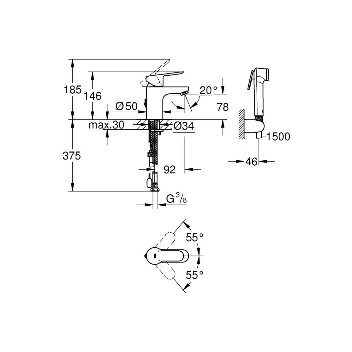 - mit Duschset, bestehend aus: Handbrause mit integriertem Umsteller, Wandbrausehalter, Brauseschlauch