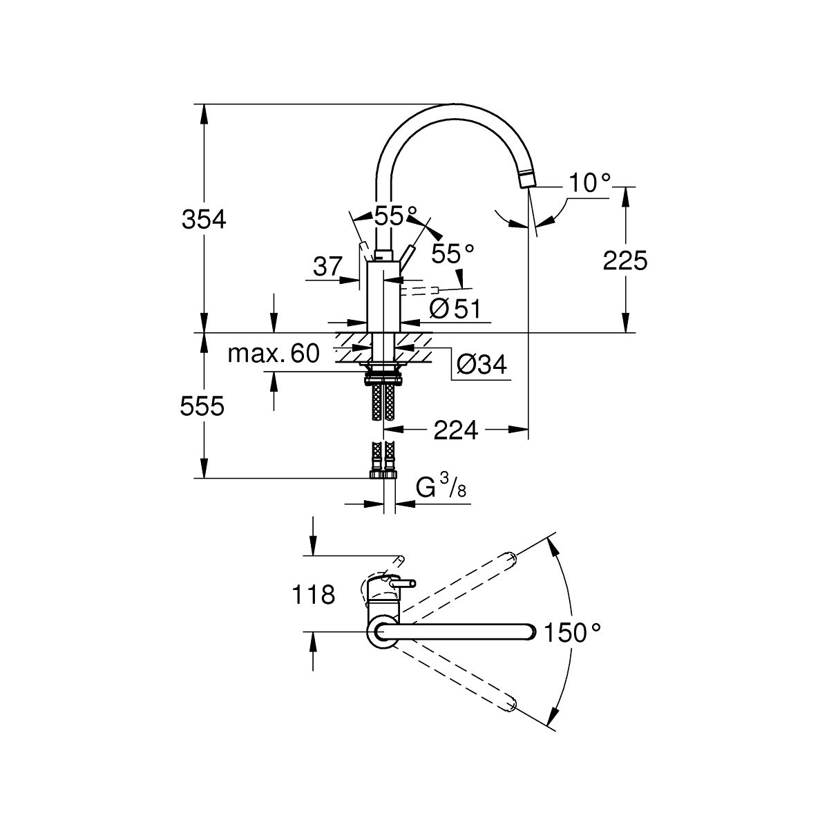 - Drehwinkel wählbar: 0° / 150°