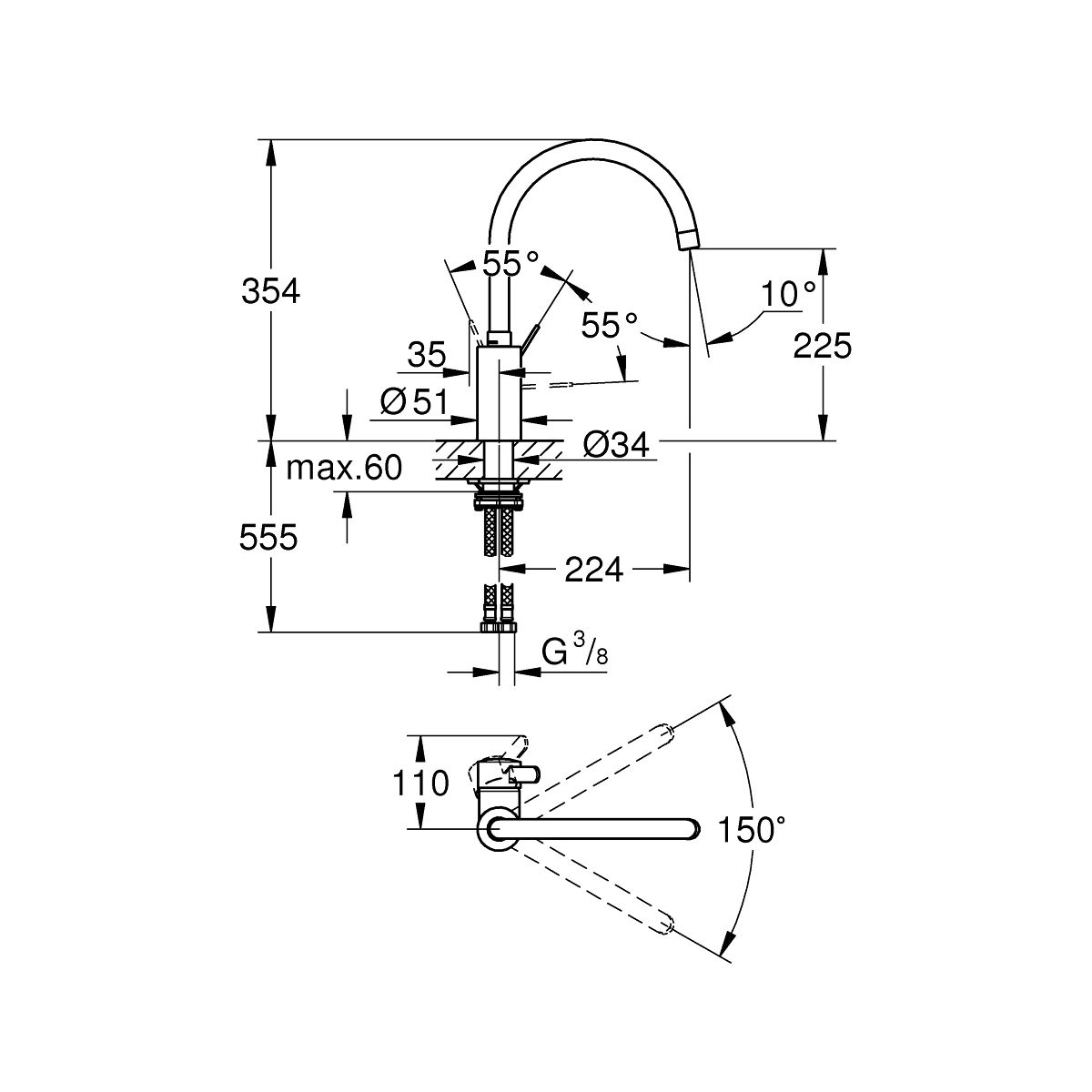 - Schwenkbarer Auslauf, Schwenkwinkel wählbar: 0° / 150°
