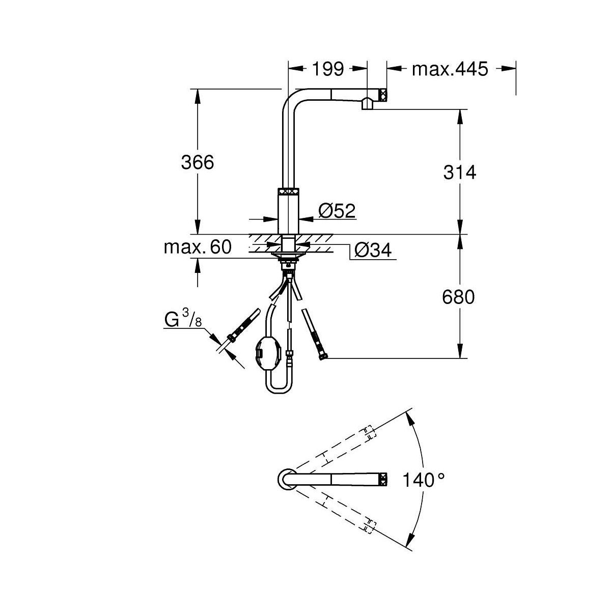 - Schwenkwinkel 140°