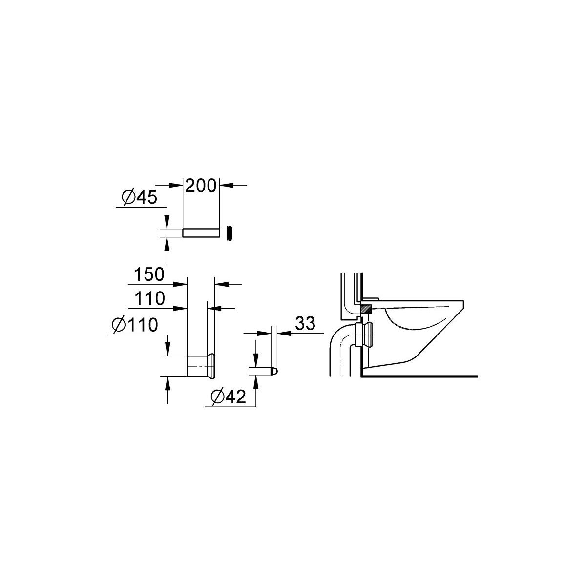 - Ø 110 mm Abmessung des in den Rahmen eintretenden Rohrs