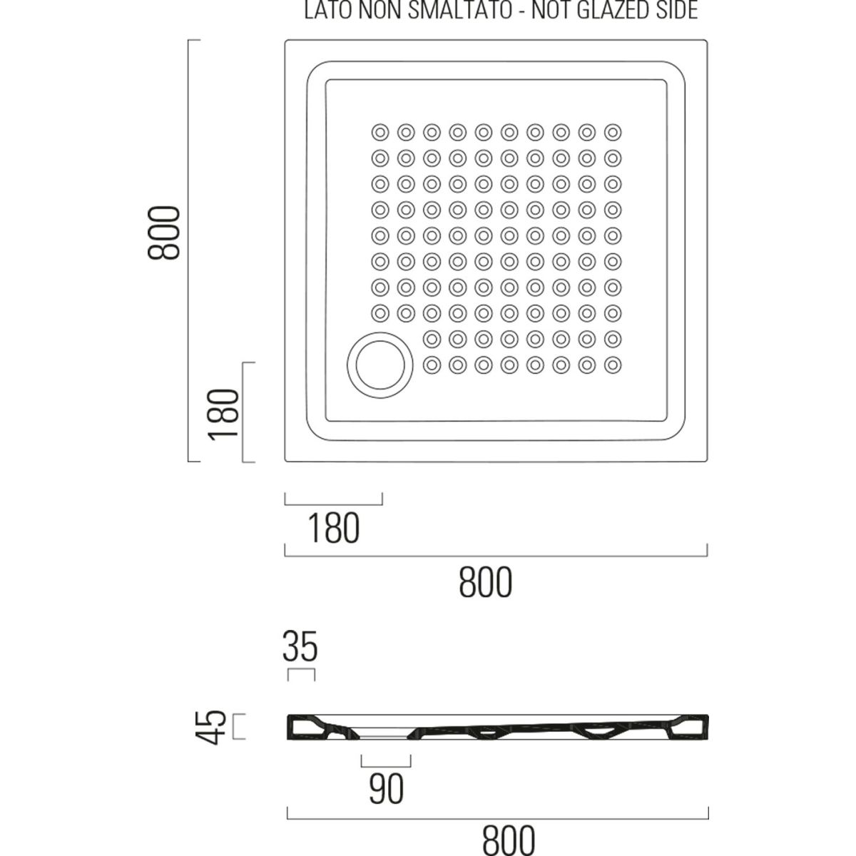 - Unglasierte Seite (unglasiert) zum Verputzen oder für Fliesen, in der technischen Zeichnung gekennzeichnet