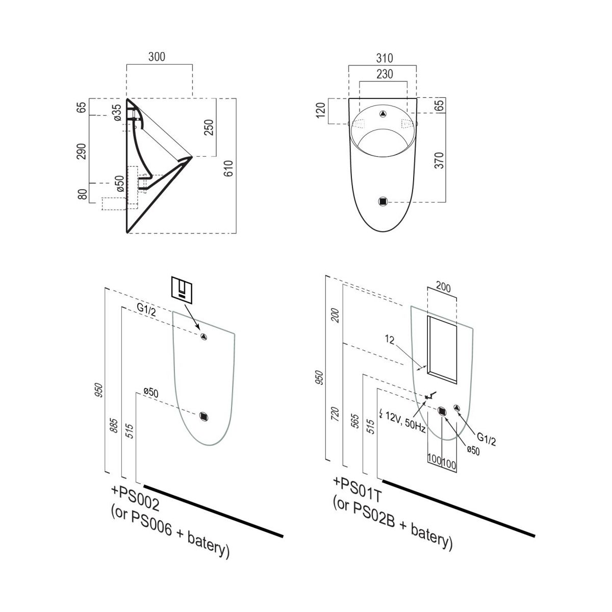 - Möglichkeit der Montage mit verschiedenen Spülsystemen: eingebauter automatischer Spülkasten PS01T oder PS02B, automatischer Unterputz-Spülkasten PS006 oder PS002 (es muss auch ein Netzteil PS05T oder PS10T installiert werden), Unterputz-Druckventil QK11051 (bei der Montage eines mechanischen Ventils wird ein Einlassanschluss mit Gummimanschette SLA02 empfohlen)