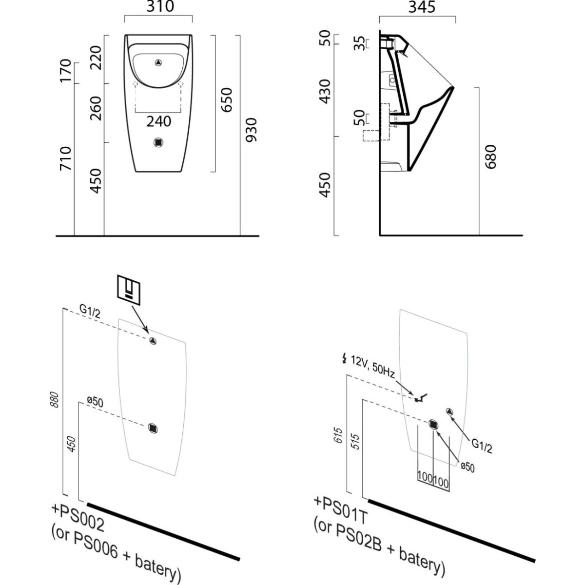 - Möglichkeit der Montage mit verschiedenen Spülsystemen: eingebauter automatischer Spülkasten PS01T oder PS02B, automatischer Unterputz-Spülkasten PS006 oder PS002 (es muss auch ein Netzteil PS05T oder PS10T installiert werden), Unterputz-Druckventil QK11051 (bei der Montage eines mechanischen Ventils wird ein Einlassanschluss mit Gummimanschette SLA02 empfohlen)