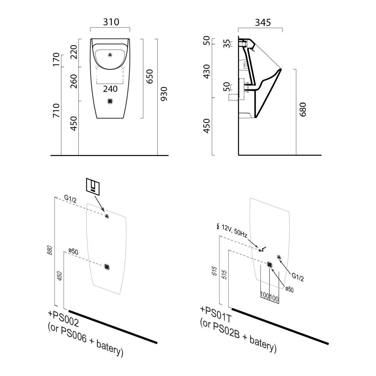 - Möglichkeit der Montage mit verschiedenen Spülsystemen: eingebauter automatischer Spülkasten PS01T oder PS02B, automatischer Unterputz-Spülkasten PS006 oder PS002 (es muss auch ein Netzteil PS05T oder PS10T installiert werden), Unterputz-Druckventil QK11051 (bei der Montage eines mechanischen Ventils wird ein Einlassanschluss mit Gummimanschette SLA02 empfohlen)