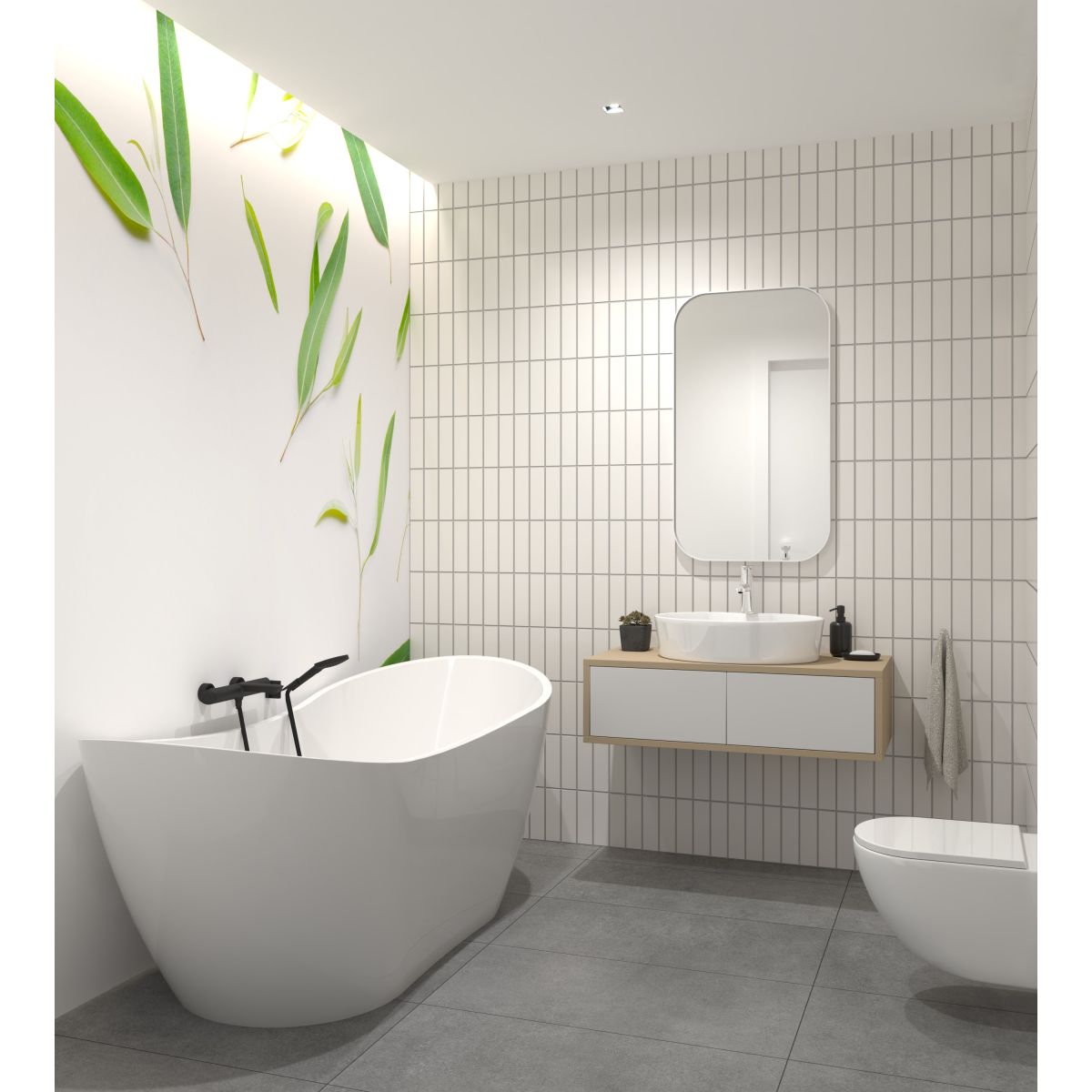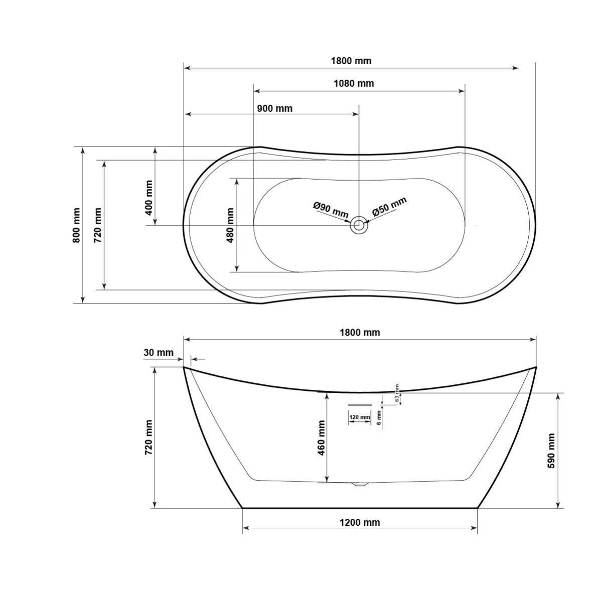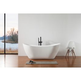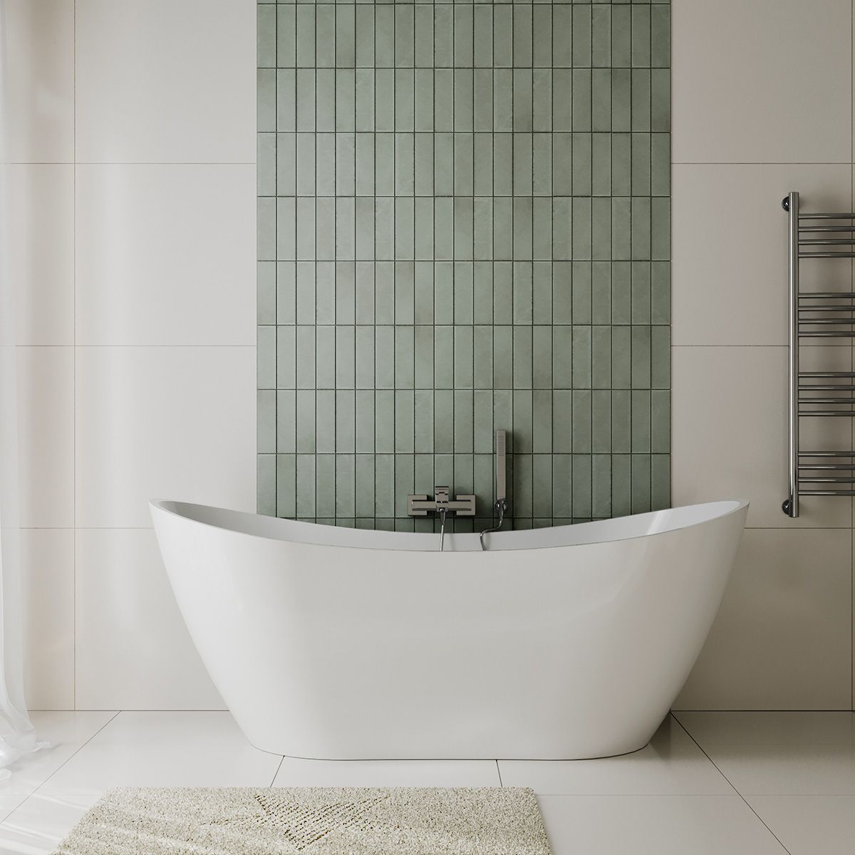 - Die freistehende Badewanne Hagser verfügt über ein integriertes Ablauf- und Überlaufsystem mit minimalistischem Schlitzüberlauf