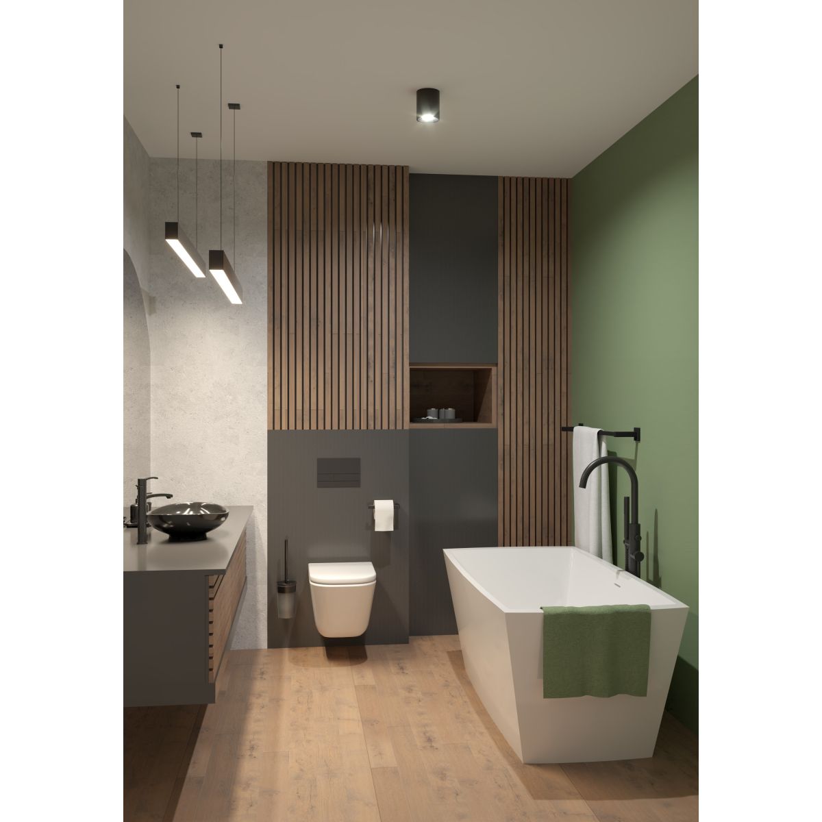 - Die freistehende Badewanne Hagser verfügt über ein integriertes Ablauf- und Überlaufsystem mit minimalistischem Schlitzüberlauf