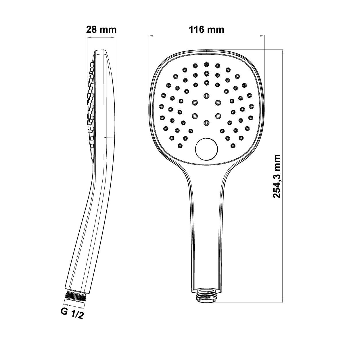 - Strahlarten: Regenstrahl, weicher Strahl, passender Strahl