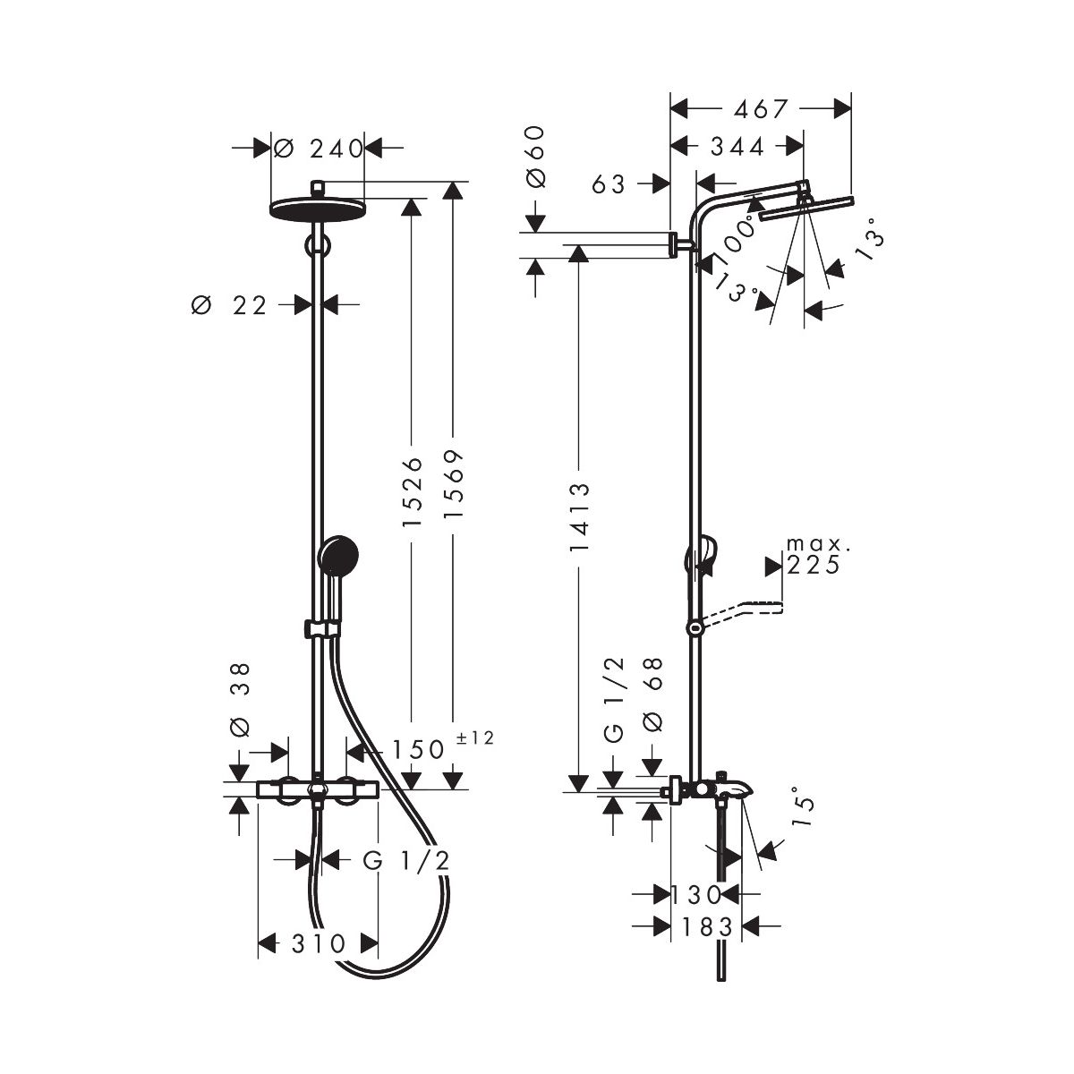 - Inbegriffen: Batterie mit Schalter, Duschkopf, Duschkopf, Duschschlauch, Duschstange