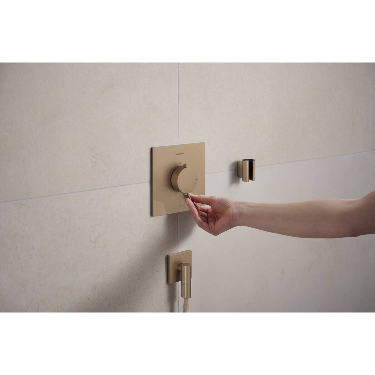 - Gewünschte Temperatur: Die Thermostatarmatur von hansgrohe hält die eingestellte Temperatur jederzeit zuverlässig aufrecht und reguliert sie bei Bedarf automatisch.