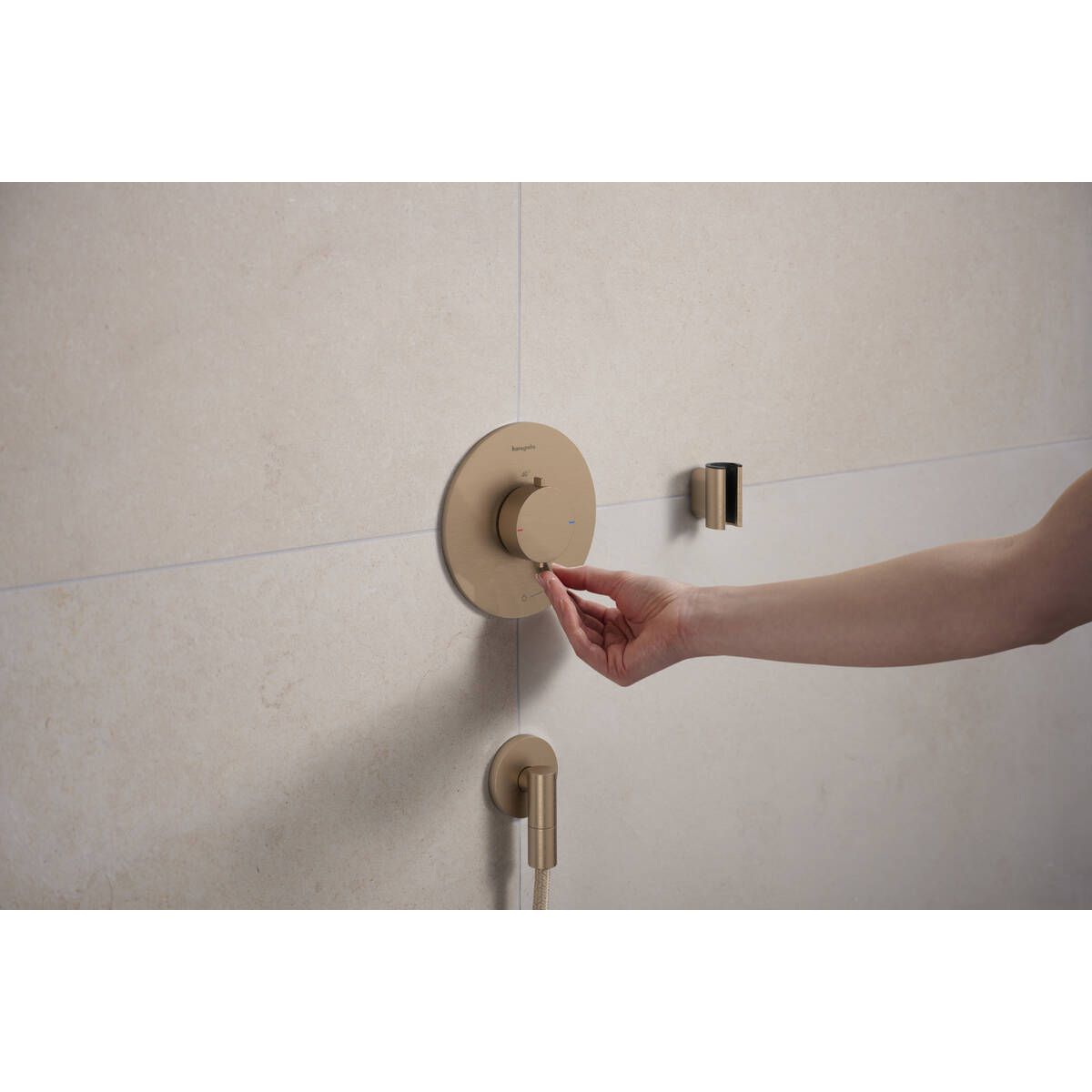- Gewünschte Temperatur: Die Thermostatarmatur von hansgrohe hält die eingestellte Temperatur jederzeit zuverlässig aufrecht und reguliert sie bei Bedarf automatisch.