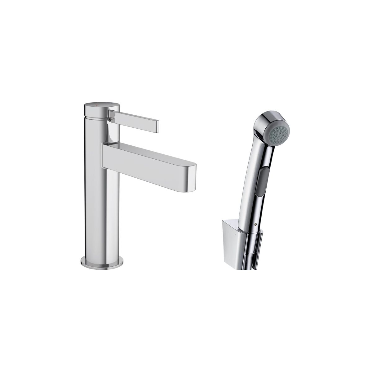 - bestehend aus Einhebel-Waschtischarmatur, Bidet-Handbrause, Duschhalter, Duschschlauch, Ablaufgarnitur