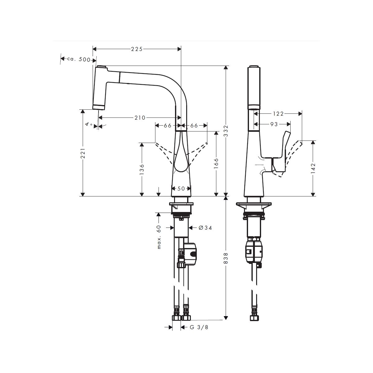- Schwenkbereich des Auslaufs 110° / 150°
