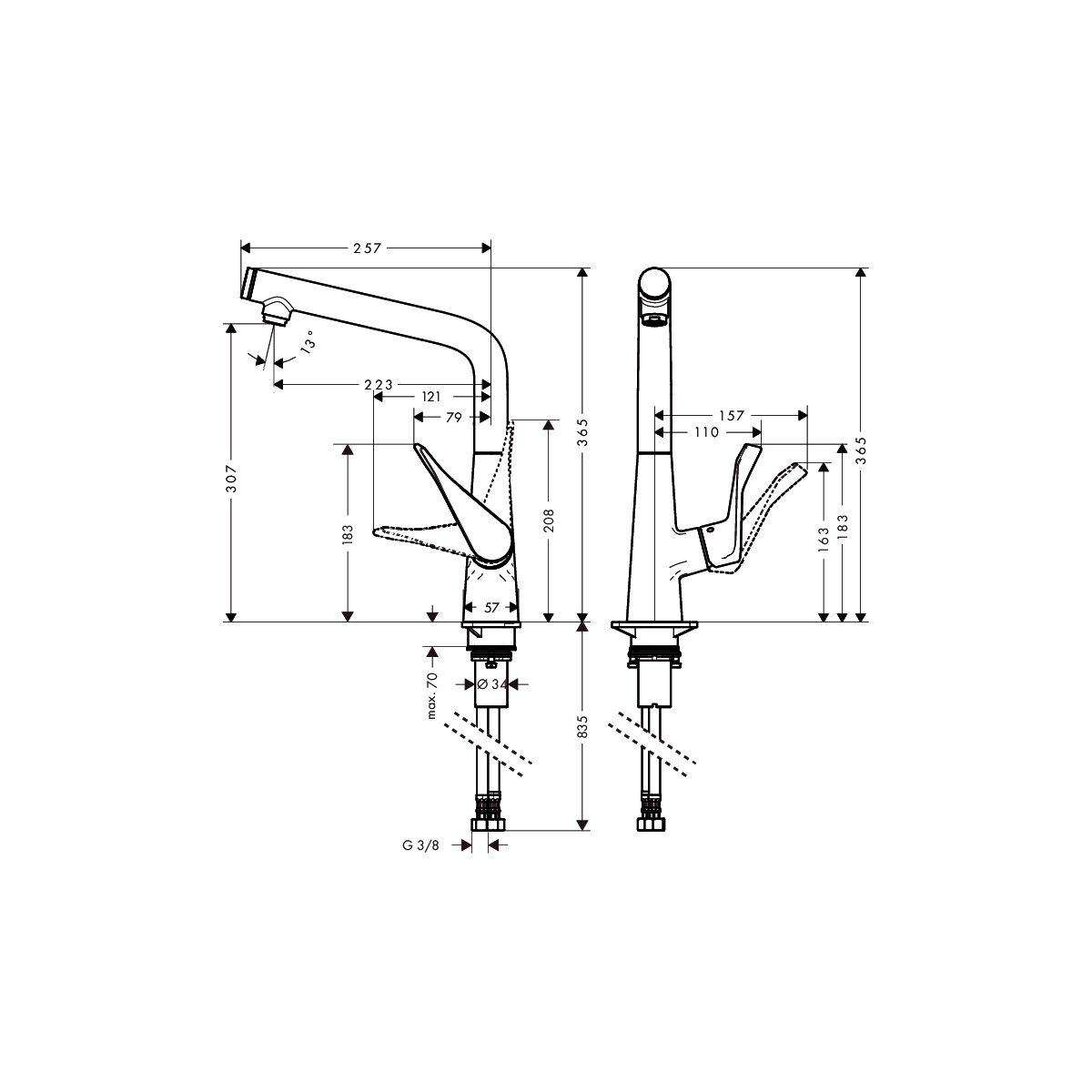 - Möglichkeit, den Schwenkbereich des Auslaufs auf 110°, 150° und 360° einzustellen