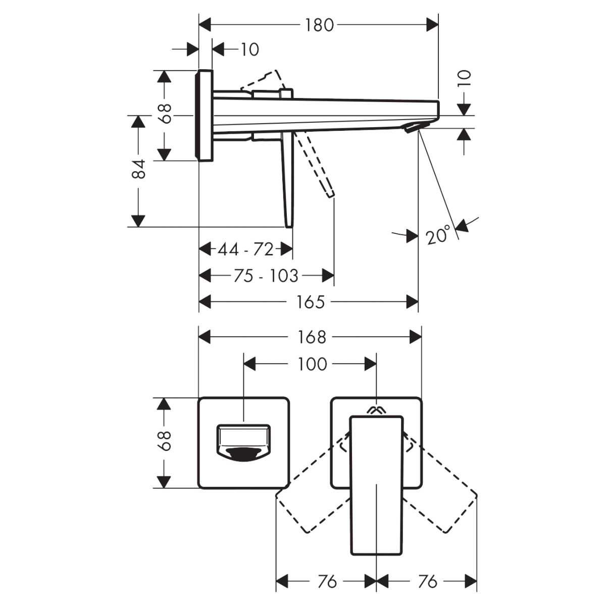 - Länge von der Wand bis zur Achse des Perlators 165 mm