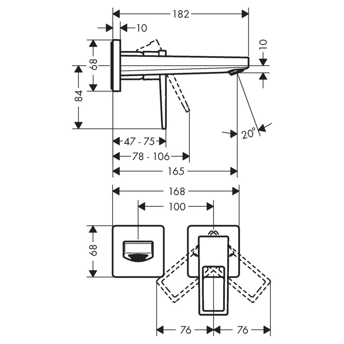 - Länge von der Wand bis zur Achse des Perlators 165 mm