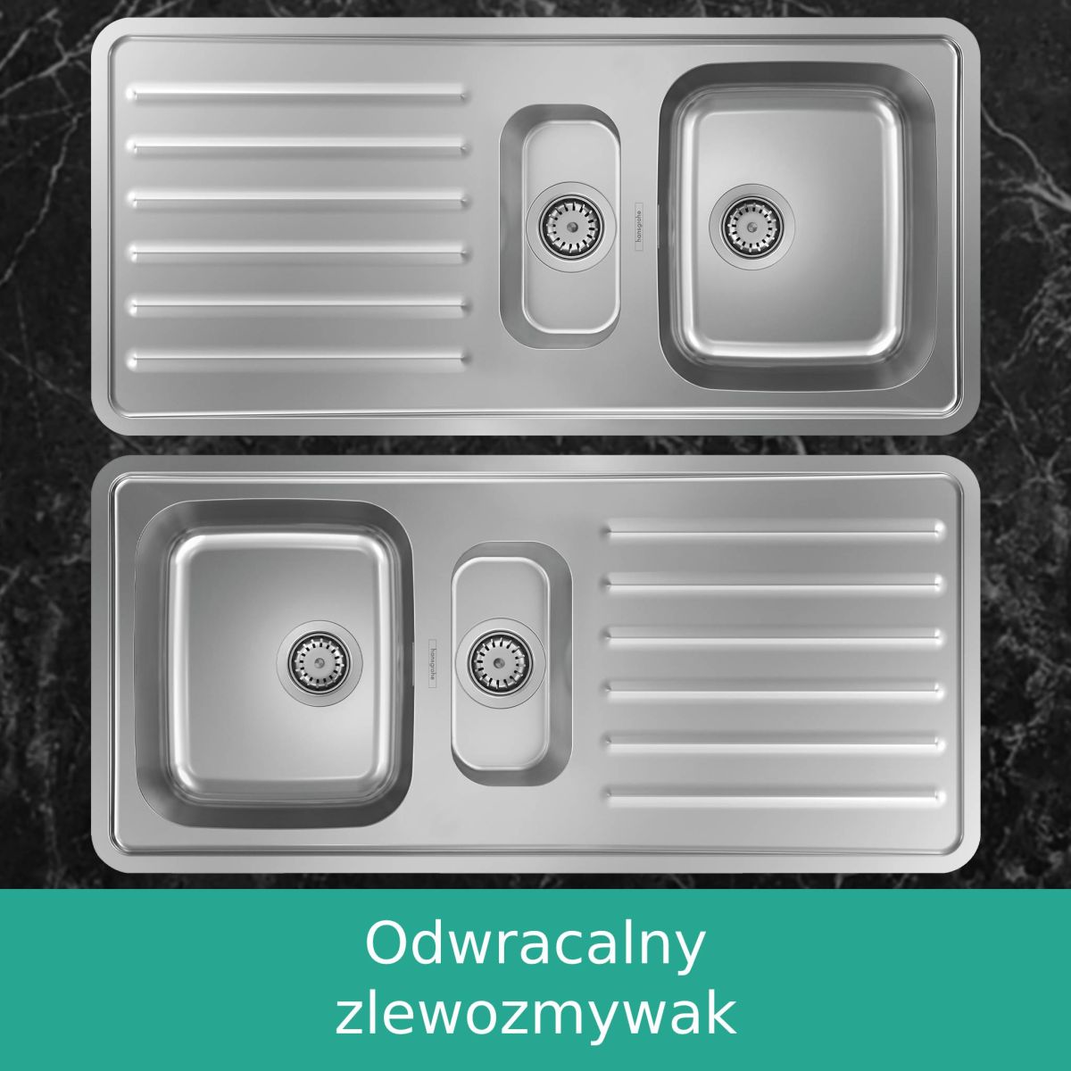 Die Edelstahl-Spüle Hansgrohe S41 mit zwei Becken (340/150/400) und Abtropffläche bietet alles, was das Arbeiten in der Küche komfortabler macht. Beide Becken und die glatte Abtropffläche aus robustem Edelstahl lassen sich dank ihres auf Bögen basierenden Designs leicht sauber halten. Durch das Fehlen von Ecken glänzt die Spüle lange wie neu. Das passende Ablaufgarnitur ist im Lieferumfang enthalten. Der Ablauf lässt sich mit einem Handgriff manuell öffnen und schließen. Komfort von Anfang an: Dieses Komplettpaket zeichnet sich durch einfache Montage und Anschluss aus.