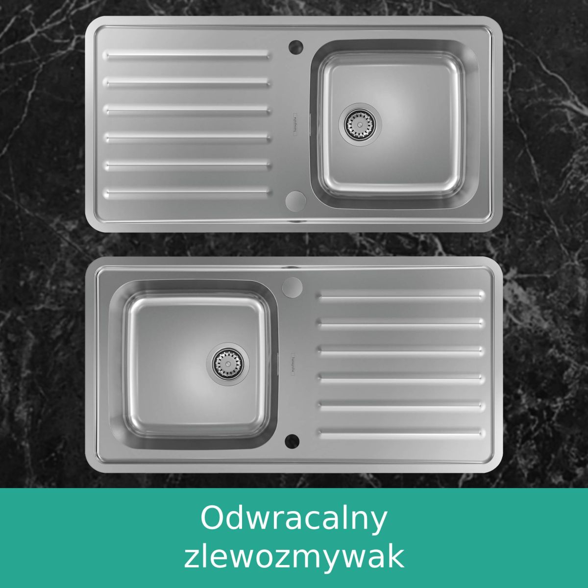Die Edelstahlspüle Hansgrohe S41 kann mit der Spülbeckenmulde links oder rechts montiert werden (Reversibilitätsprinzip). Dies wird durch die beidseitig angebrachten Löcher für die Armatur ermöglicht. Nachdem Sie sich entschieden haben, platzieren Sie die Ablaufsteuerung entsprechend. Die Spüle selbst kann auf einem Schrank oder bündig mit der Arbeitsplatte montiert werden. Die Breite des Schranks sollte mindestens 50 cm betragen.