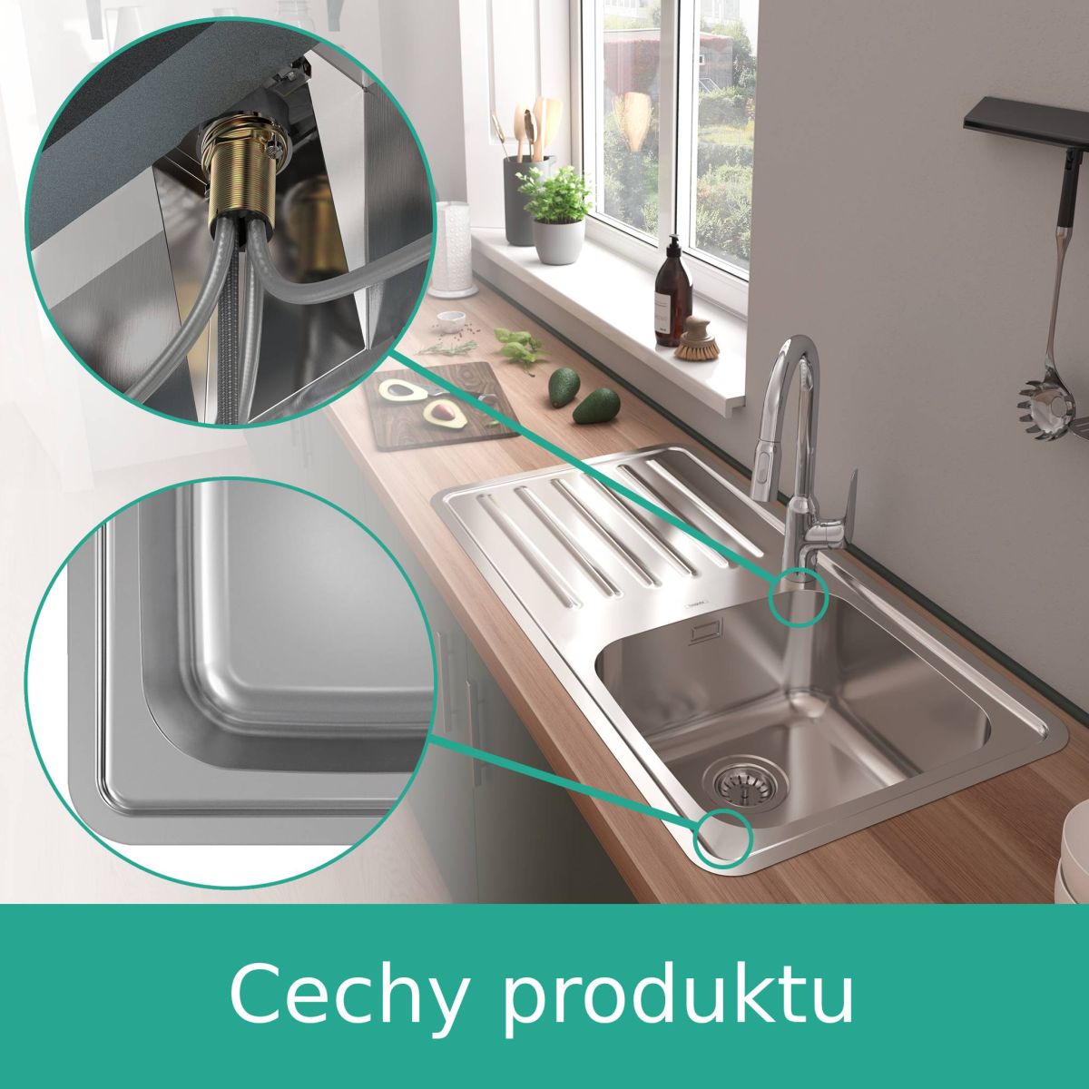 Eine zusätzliche Verstärkung unter der Armatur garantiert Stabilität auch bei hohen Armaturen. Perfekte Sets entstehen in Kombination mit Armaturen aus den Serien Focus M41 und M42 von Hansgrohe. In die bereits im Spülbecken vorhandenen Öffnungen mit einem Durchmesser von 35 mm passen auch andere Küchenarmaturen. Auf der Unterseite des Spülbeckens befindet sich eine Dämpfungsmatte, die das Geheimnis des leisen Wasserflusses darstellt. Sie dämpft Vibrationen und absorbiert Geräusche.