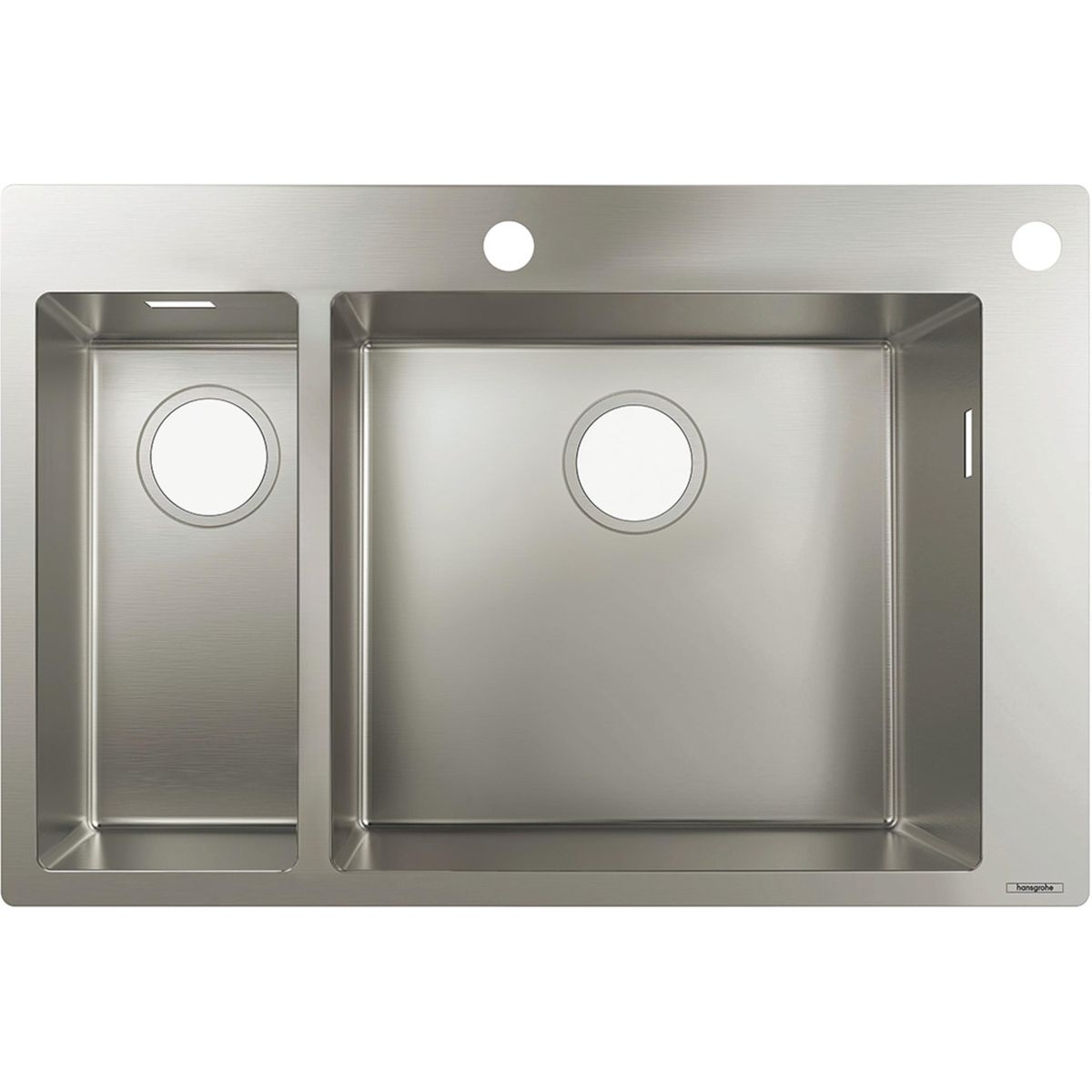 Die Aufsatzspüle S71 180/450 von Hansgrohe aus Edelstahl für einen 80 cm hohen Unterschrank ist dank Haupt- und Nebenbecken perfekt geeignet, um komfortables Arbeiten in der Küche zu ermöglichen, wenn verschiedene Tätigkeiten gleichzeitig ausgeführt werden. Die rechteckige, minimalistische Form passt sich jeder Kücheneinrichtung an und harmoniert auf vielfältige Weise mit der individuellen Ausstattung. Die Konstruktion mit breitem L-förmigem Rand setzt ästhetische Akzente und macht die Spüle zu einem Blickfang in der Küche. Dank der Öffnung für die Armatur und der vorgebohrten Öffnung für die Fernbedienung des Abflusses ist dieses Produkt optimal für noch mehr Komfort bei den täglichen Küchenarbeiten konzipiert. Hochwertiges und ergonomisch vielseitiges Design für die Küche.