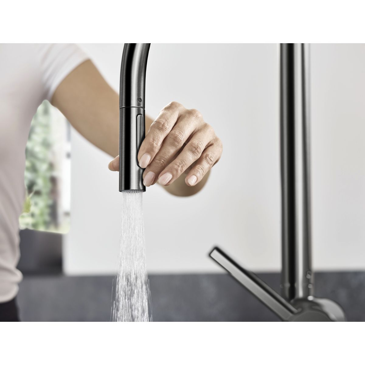 - Duschstrahl, Strahlwechsel durch Drücken des Strahlumschalters und automatische Strahlrückstellung nach Schließen des Griffs