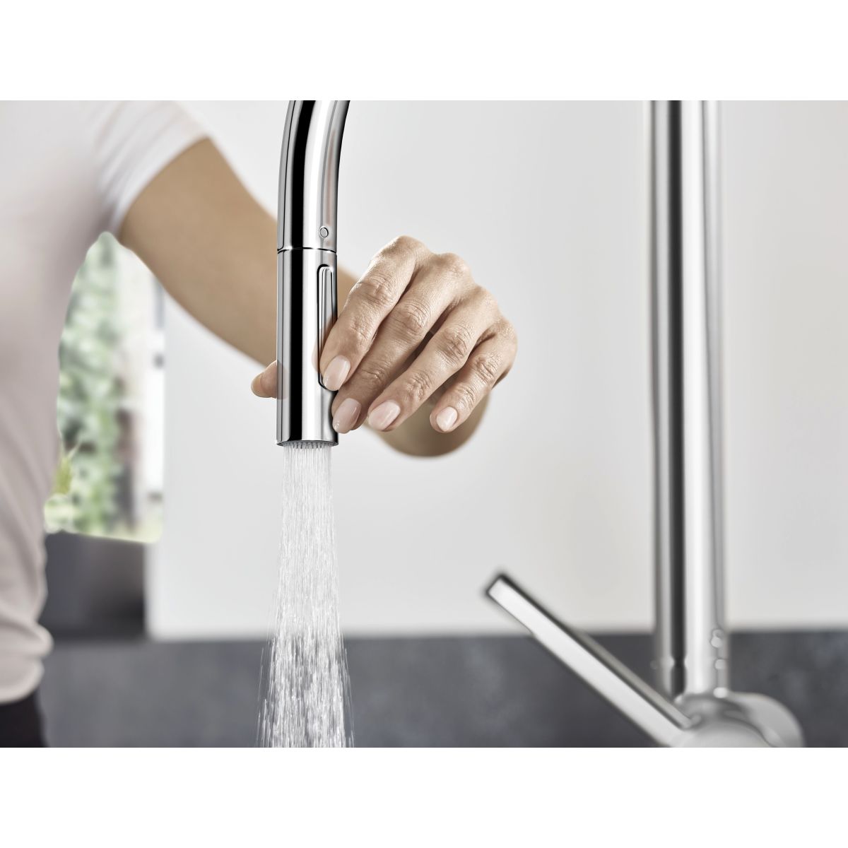 - Duschstrahl, Strahlwechsel durch Drücken des Strahlumschalters und automatische Strahlrückstellung nach Schließen des Griffs